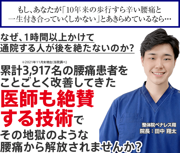 もしあなたが今、上記のようにお悩みなら、もしあなたが今、ほんの少しでも⼼のどこかに、よくなりたいと思うのなら整体院ペナレス翔~PenaresSho~に来院し、そのつらい腰痛を根本改善しませんか?