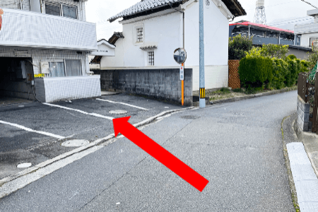 5見通しが悪くなる位置で左側にマンションがあります。お部屋の前の7番にお止めください