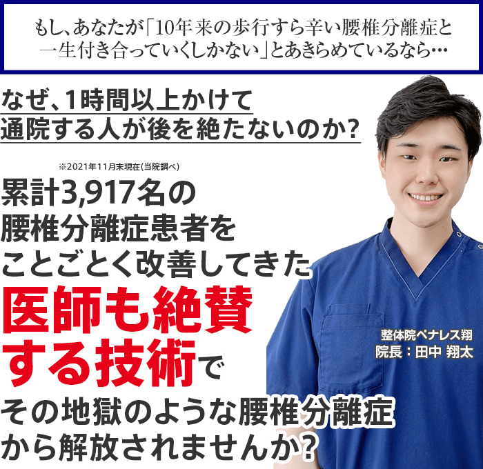 もしあなたが今、上記のようにお悩みなら、もしあなたが今、ほんの少しでも⼼のどこかに、よくなりたいと思うのなら整体院ペナレス翔~PenaresSho~に来院し、そのつらい腰椎分離症を根本改善しませんか?